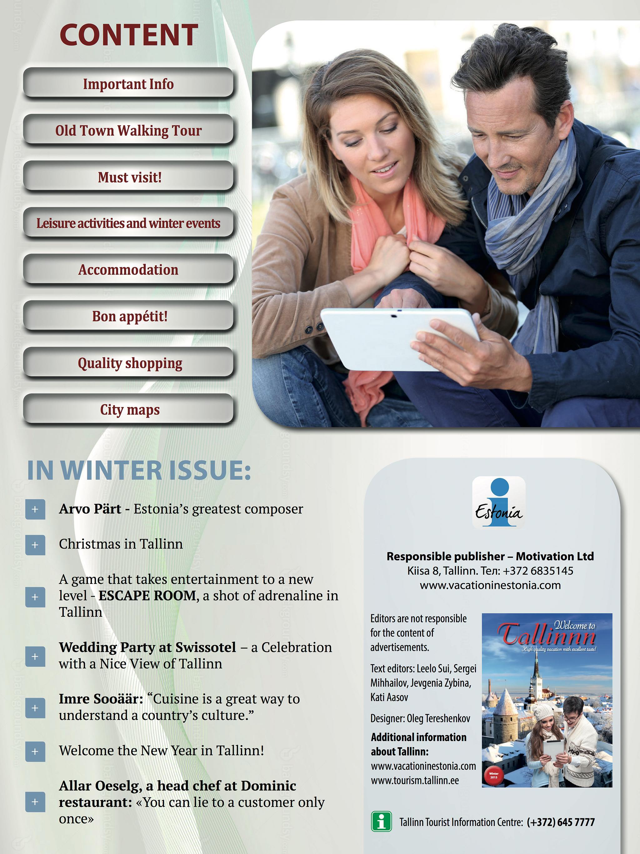 "Welcome to Tallinn" Digital Magazine ist ein praktischer und innovativer Reiseführer in englischer und russischer Sprache, der zweimal im Jahr, im Juni und im Dezember (Sommer, Winter) ausgestellt wurde, einschließlich der Sehenswürdigkeiten von Tallinn, Tallinn Map, Unterkunft, Catering, Einkaufsmöglichkeiten und Freizeitmöglichkeiten.